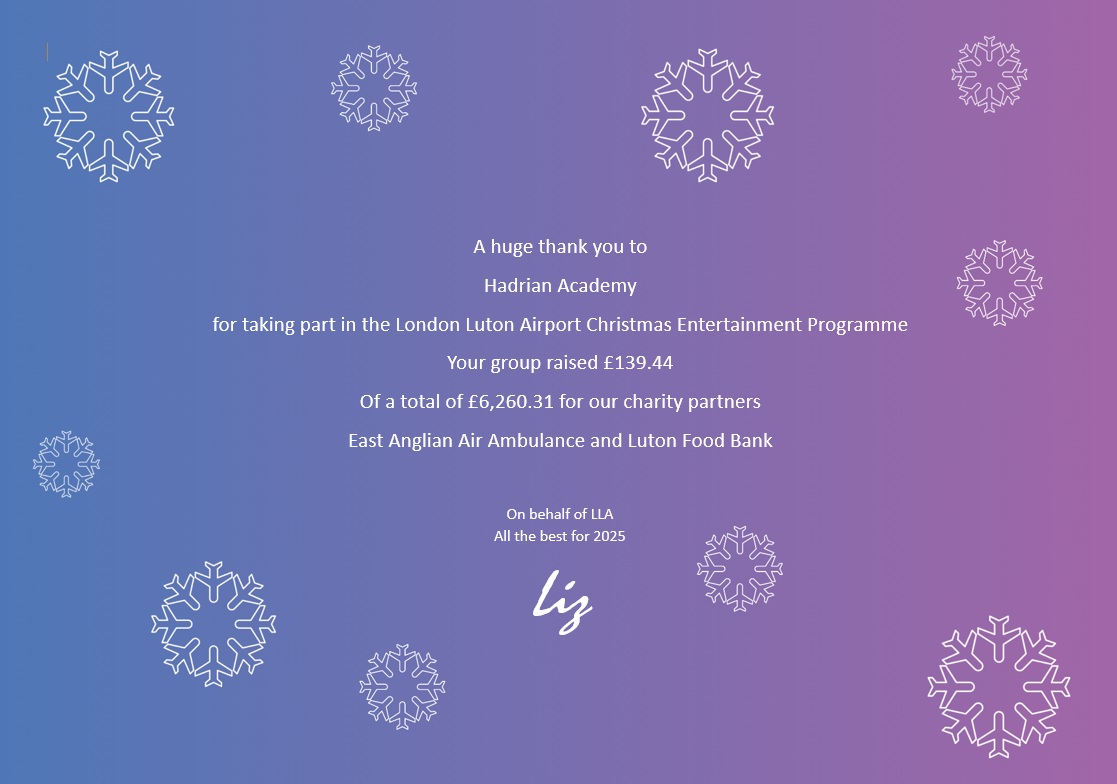 Hadrian Academy choir attended the annual Christmas event at London Luton Airport. They sang to travellers arriving and departing from the airport whilst raising money for the airports chosen charities.